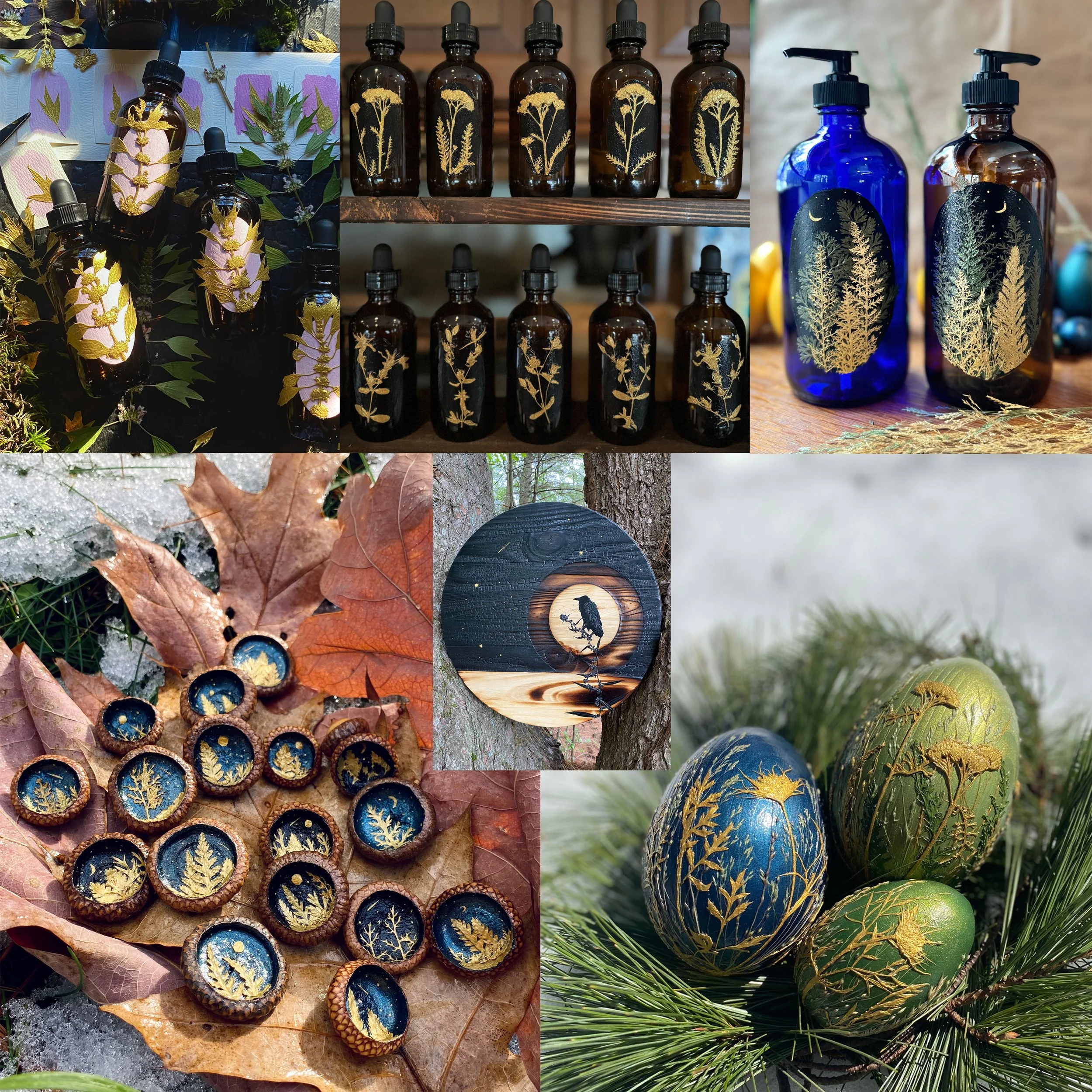 Sometimes an exploration, sometimes a grounding meditation, my artwork in Constellation primarily revolves around the Japanese method of Shou Sugi Ban wood charring and preservation. I create custom, decorative interior boards, which are part of the shop’s aesthetic framework, but I’ve also established a language to create anything from wall-hanging “Cosmic Discs” to divination devices, shelving, signs, gates, tables, dice and flower presses. These are often collaborative efforts with my wife, Rosannah von Moritz, who adds her painting and pressed flower decoupage work to the pieces. We both try to price our art to be accessible to the general public. For now, we will be selling a majority of these works in-shop, but you can email me if you are interested in purchasing or commissioning a piece from afar.